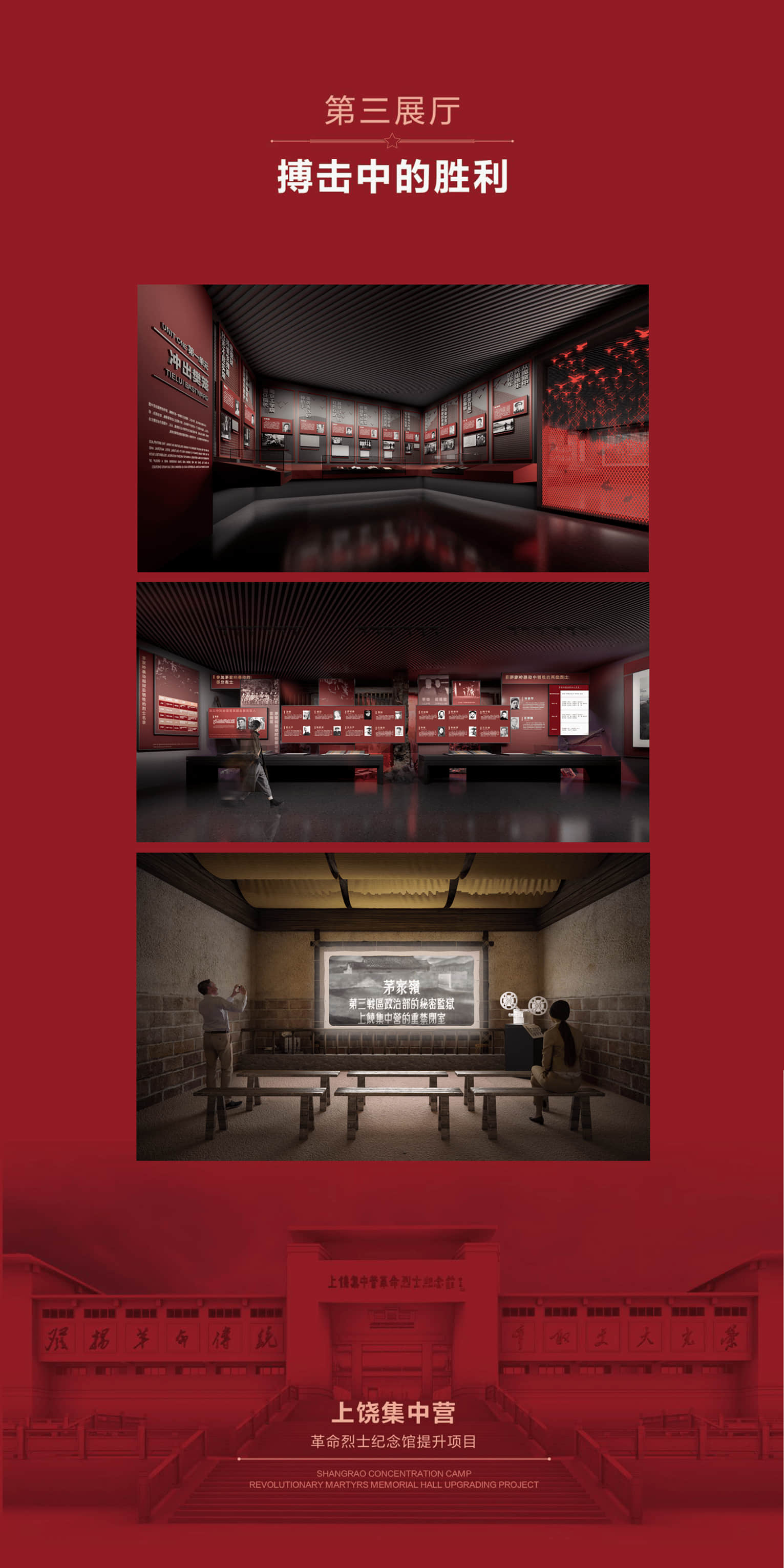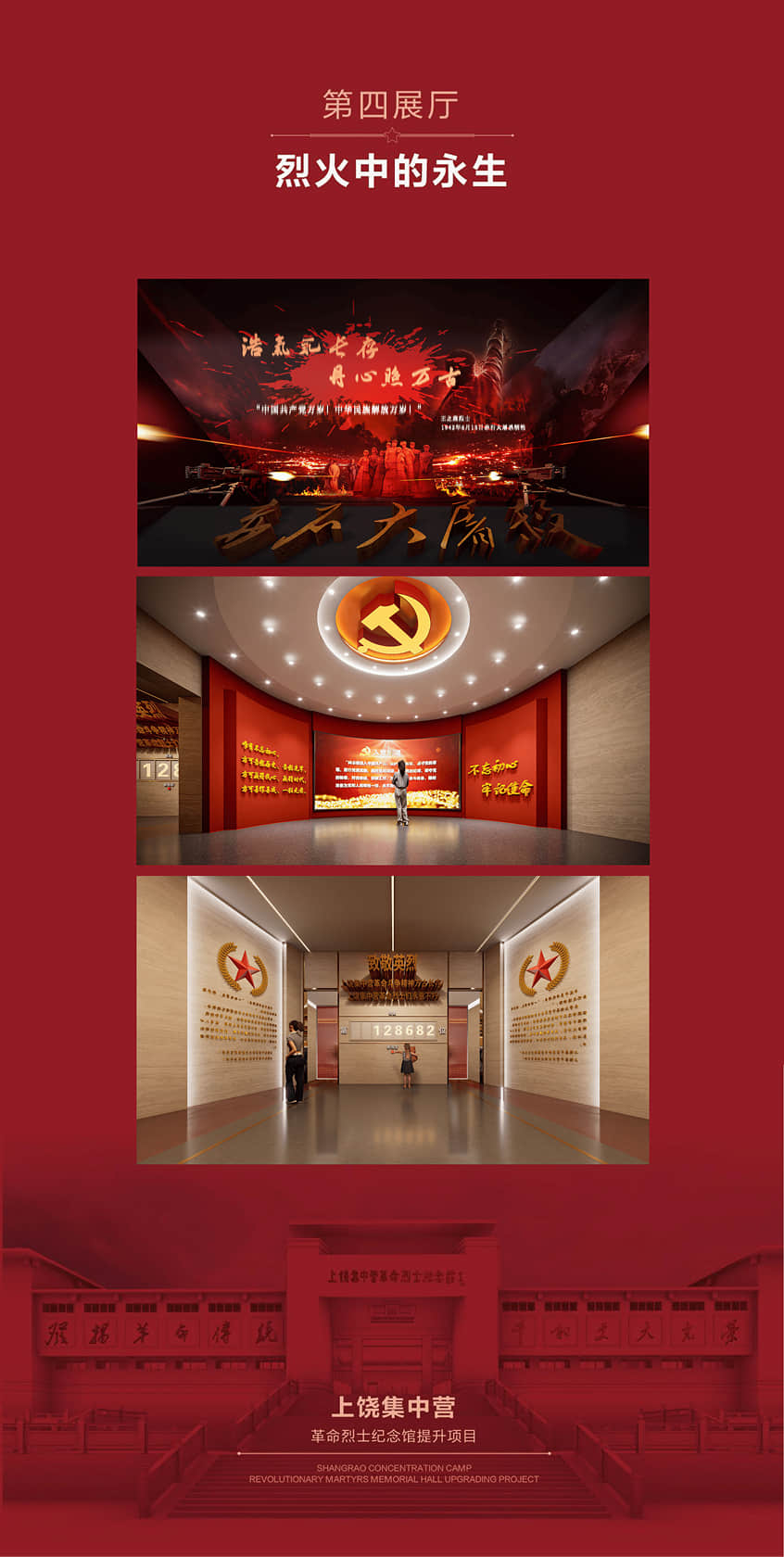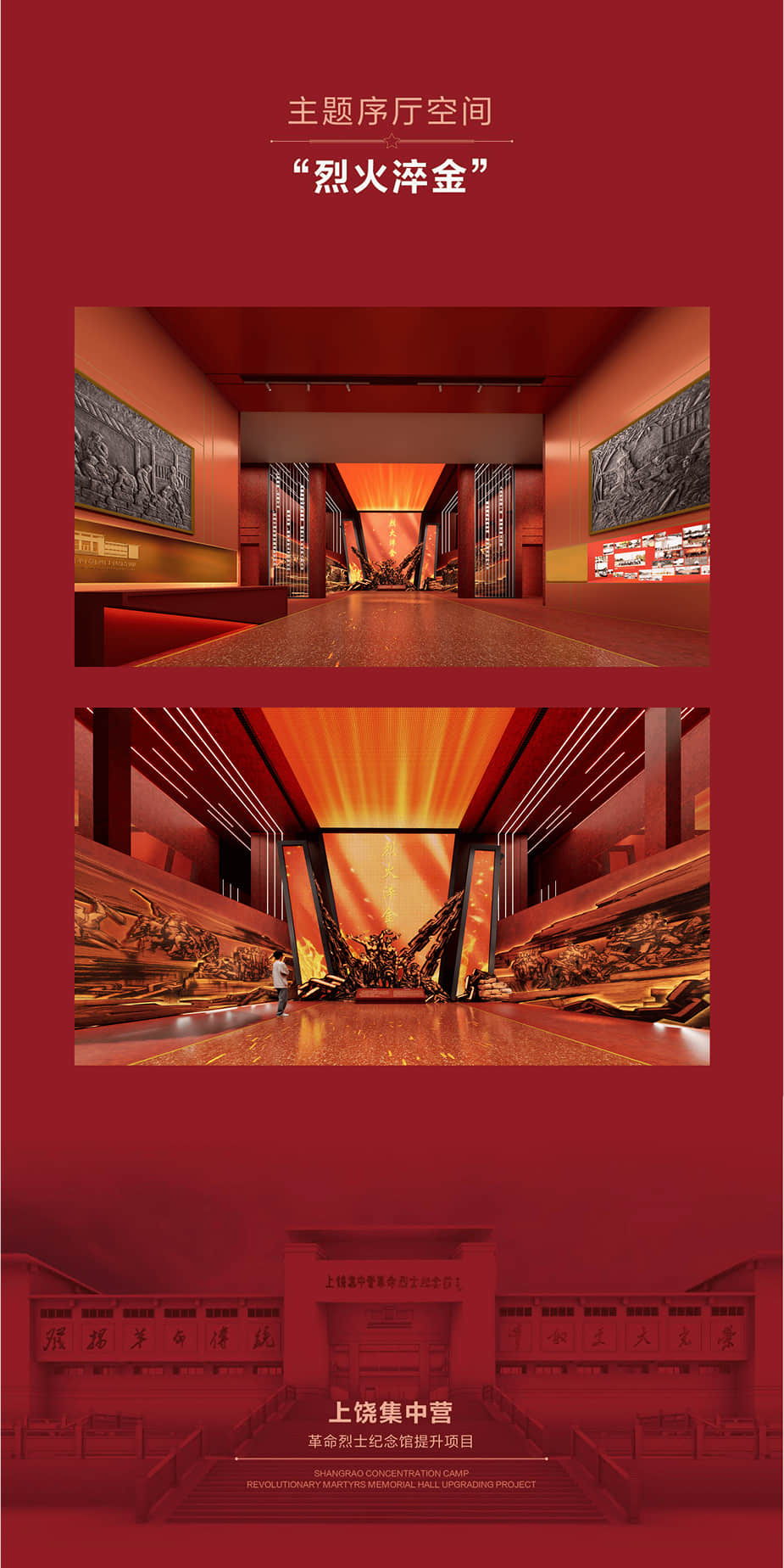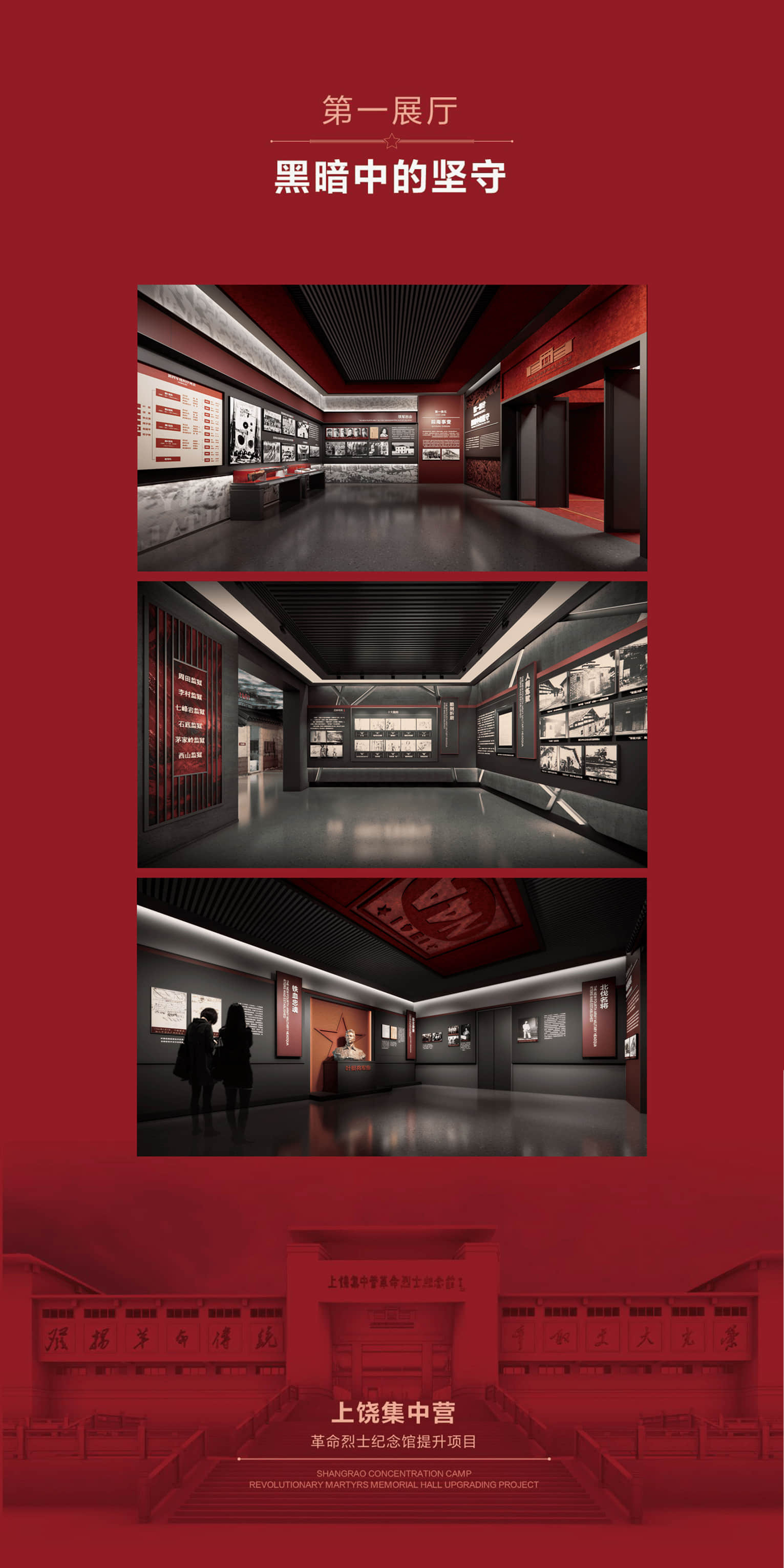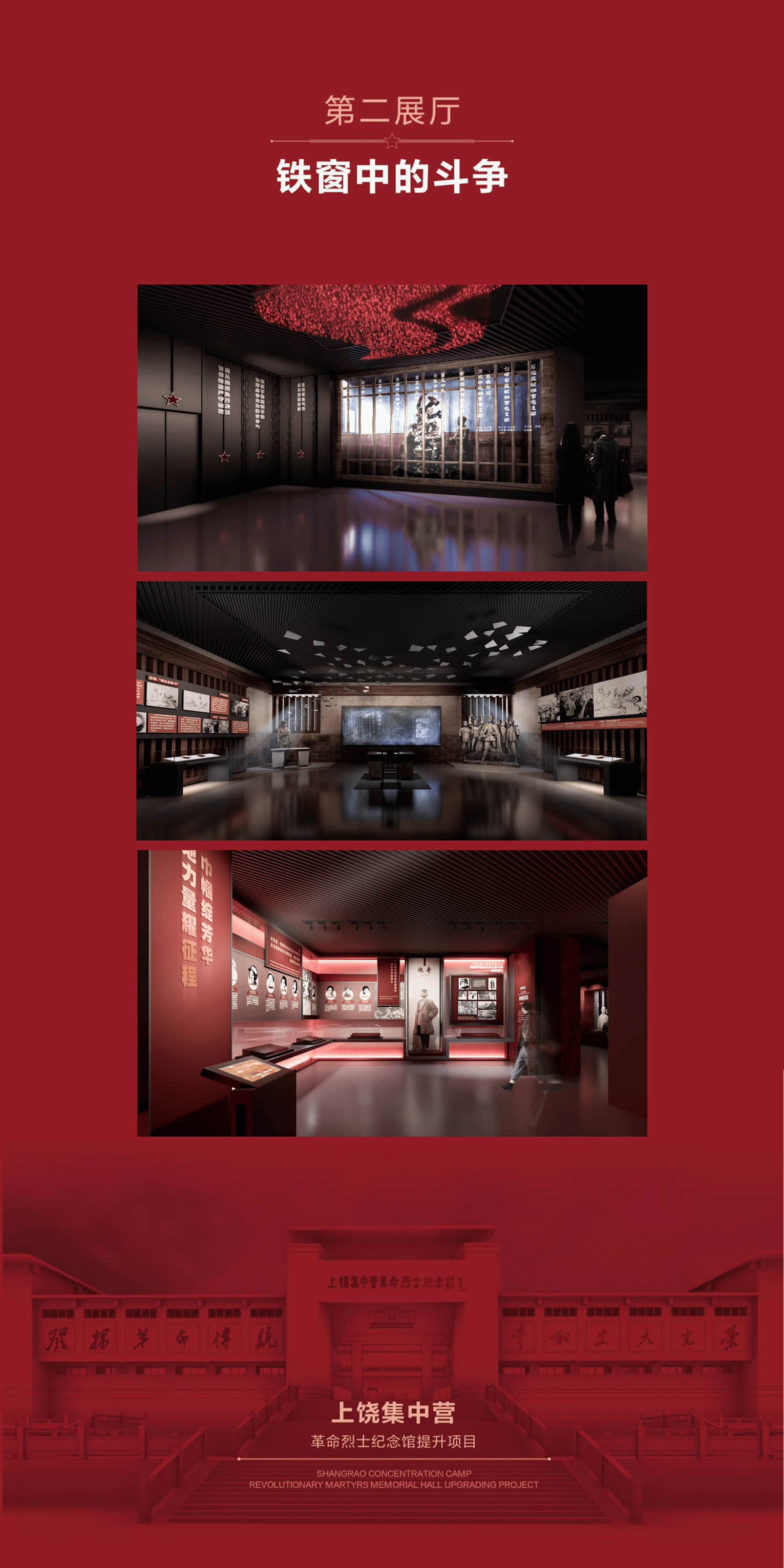 上饶集中营革命烈士纪念馆展陈提升,以“烈火淬金”为主题,设置黑暗中的坚守、铁窗中的斗争、搏击中的胜利、烈火中的永生四大板块,围绕上饶集中营革命志士不屈斗争为主线,结合数字技术、全景沉浸式多维探索,再现上饶集中营革命志士英勇斗争的场景。