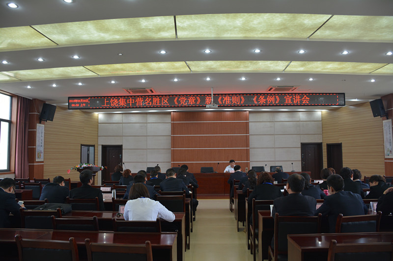 为进一步促进党员学习党章,了解新的《准则》和《条例》等党内法规,切实增强广大党员和领导干部知纪、明纪、遵纪、守纪意识,使党的纪律和各项要求刻在党员干部心里,4月8日上午,在管理中心三楼会议室,举行了上饶集中营名胜区《党章》新《准则》《条例》宣讲会,管委会副主任蔡丽君主持会议,党工委书记况华作专题宣讲,全体党员干部认真聆听了宣讲。
