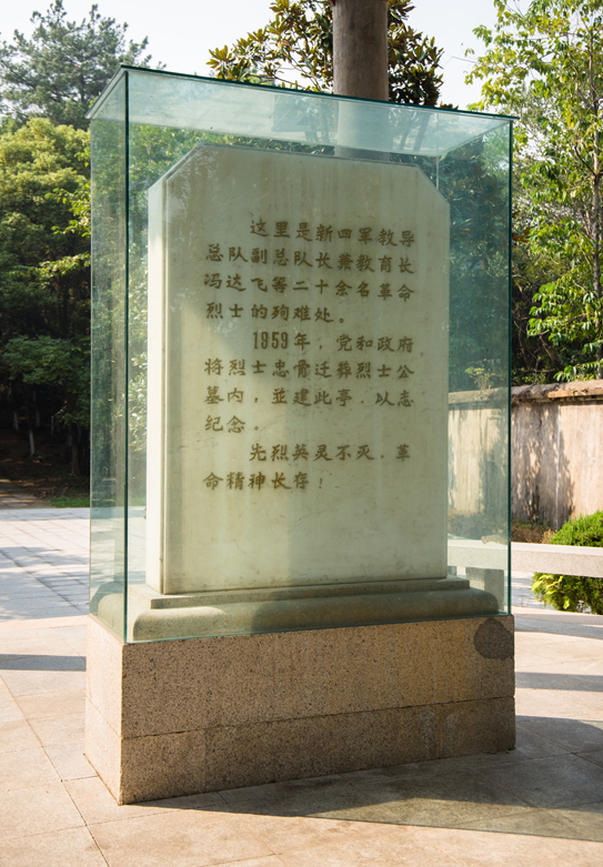 这座六角形翘檐式纪念亭,始建于1959年,重建于2009年。解放初,人民政府民政部门根据当年目睹者记忆所及,在茅家岭雷公山北麓,挖掘出新四军第二总队副司令员、教导总队副总队长兼教育长冯达飞、机要员施奇等15具烈士忠骨。特建此纪念亭,并在石碑上刻有祭文,以示纪念。