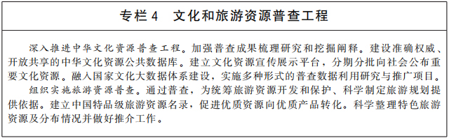 深入推进中华文化资源普查工程,协同推进旅游资源普查工作。加强石窟寺保护展示,推进大遗址保护利用和国家考古遗址公园建设,合理配套旅游服务功能。推动革命文物集中连片保护利用和党史文物保护展示,提升重大事件遗迹、重要会议遗址、重要机构旧址、重要人物旧居保护展示水平。推动有条件的文博单位增强旅游服务功能,提高展陈水平。依托非遗馆、非遗传承体验中心(所、点)、非遗工坊等场所培育一批非遗旅游体验基地,推动非遗有机融入旅游产品和线路,实现更好传承传播。对代表社会主义建设成就重大工程项目进行合理旅游开发,深入挖掘其中蕴含的精神内涵。创新“四个共同”的中华民族历史观在旅游景区景点展陈方式,向游客讲好中华民族共同体故事。