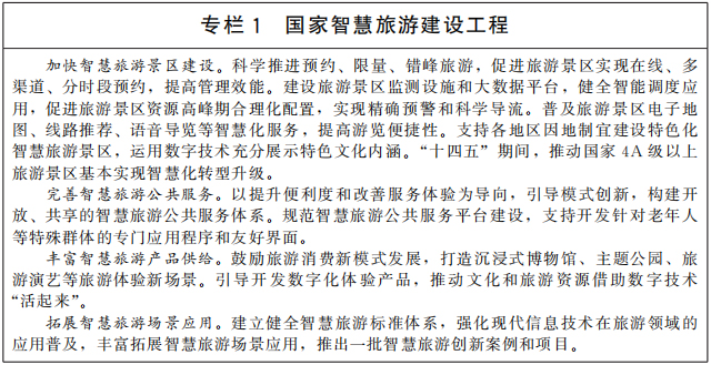 打造一批智慧旅游城市、旅游景区、度假区、旅游街区,培育一批智慧旅游创新企业和重点项目,开发数字化体验产品,发展沉浸式互动体验、虚拟展示、智慧导览等新型旅游服务,推进以“互联网+”为代表的旅游场景化建设。提升旅游景区、度假区等各类旅游重点区域5G网络覆盖水平。推动停车场、旅游集散中心、旅游咨询中心、游客服务中心、旅游专用道路、旅游厕所及旅游景区、度假区内部引导标识系统等数字化、智能化改造升级。通过互联网有效整合线上线下资源,促进旅行社等旅游企业转型升级,鼓励旅游景区、度假区、旅游饭店、主题公园、民宿等与互联网服务平台合作建设网上旗舰店。鼓励依法依规利用大数据等手段,提高旅游营销传播的针对性和有效性。